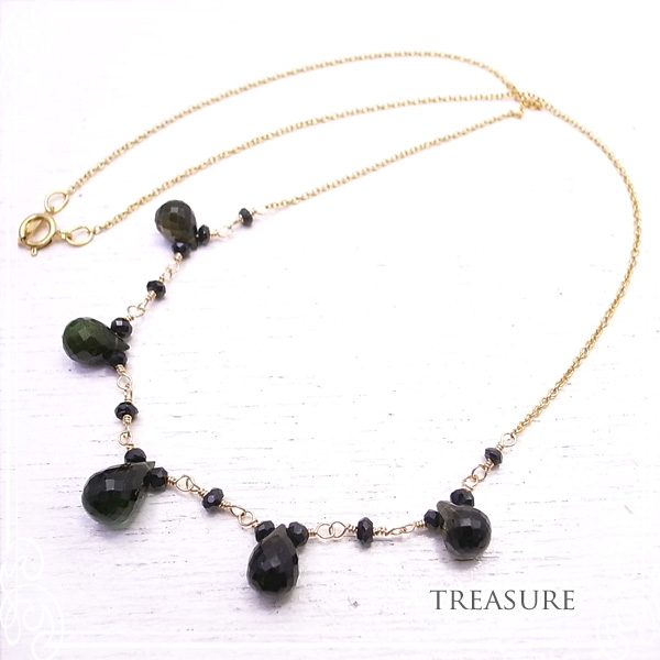 ブリオレットカットトルマリンとスピネルの14KGFゴールドフィルドネックレス