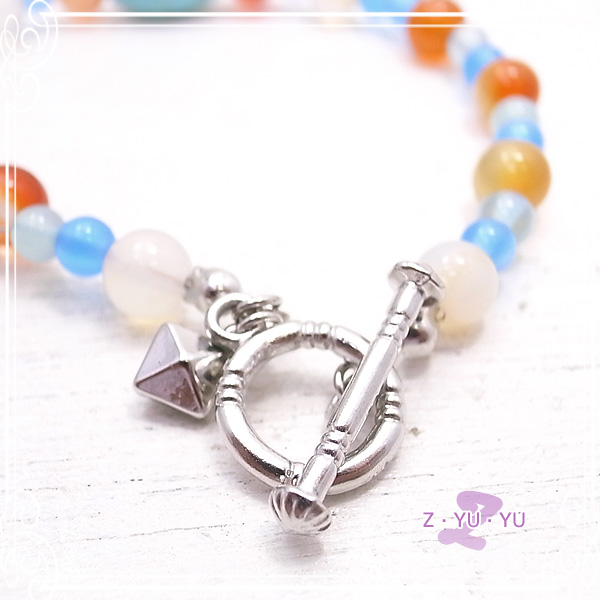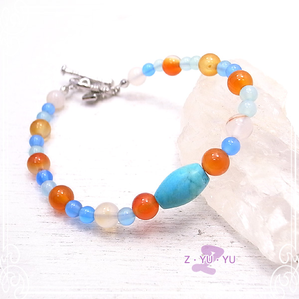アゲートと、ターコイズの小さい石でまとめ、オレンジ色と、