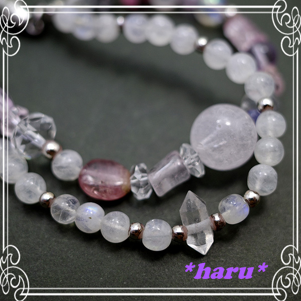 クンツァイト約10mm タンザナイト約3.6mm ルビー約3mm ブルームーンストーン約5mm ハーキマーダイヤモンド約10*4mm ピンクトルマリン約4-8mm 水晶約6mm ローズクォーツ約6mm 内周約15cm