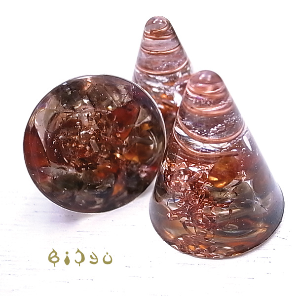 スモーキークォーツとオレンジガーネットのミニ円錐型オルゴナイトです。