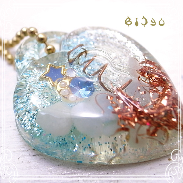 レジン(樹脂)、水晶、アクアマリン、メタルチャーム、銅、ラメ、金属チェーン