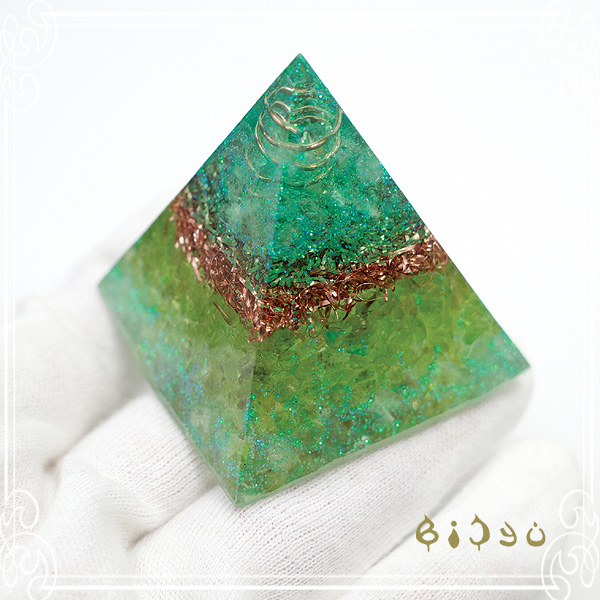 美しいペリドットのピラミッド型オルゴナイトです。