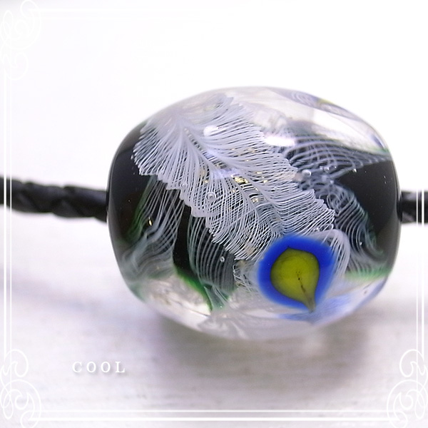 濃いグリーンのガラスに孔雀の羽をイメージした模様ガラスと金箔を入れています。