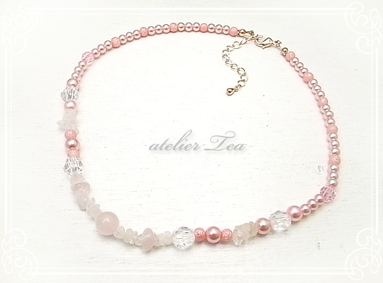 天然石(ローズクオーツ)・ガラスパール・シュガーパール・アクリルビーズ・金属・ガラスビーズ・テグス