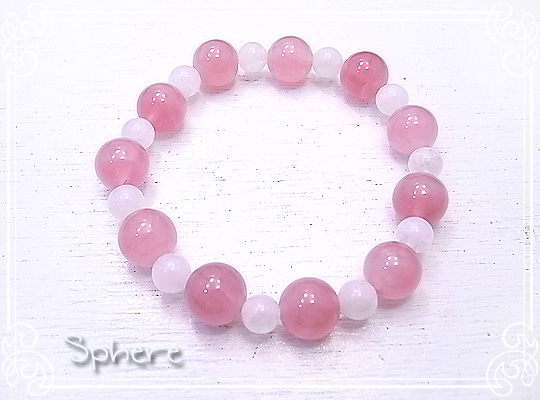 ディープローズクォーツ(ラウンド10mm)、レインボームーンストーン(ラウンド6mm)、オペロンゴム