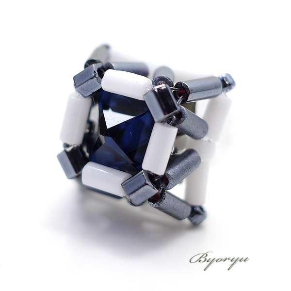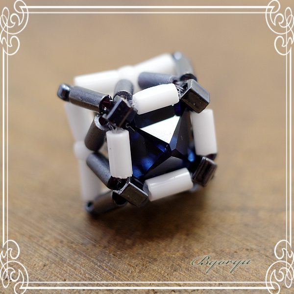 ピラミッド型のガラスストーンをビーズで包み込むように編みました。