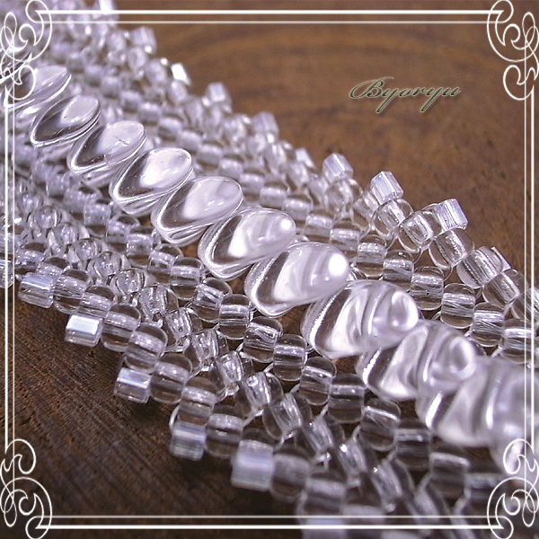 透明感にこだわり、ビーズの影に馴染みやすいライトグレーのテグスを使いました。