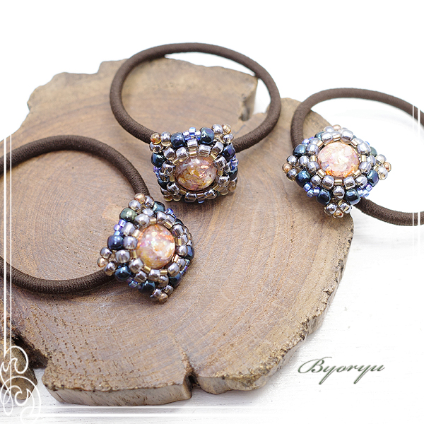エポキシレジン製の球体をビーズで包み、四角いモチーフを作りました。