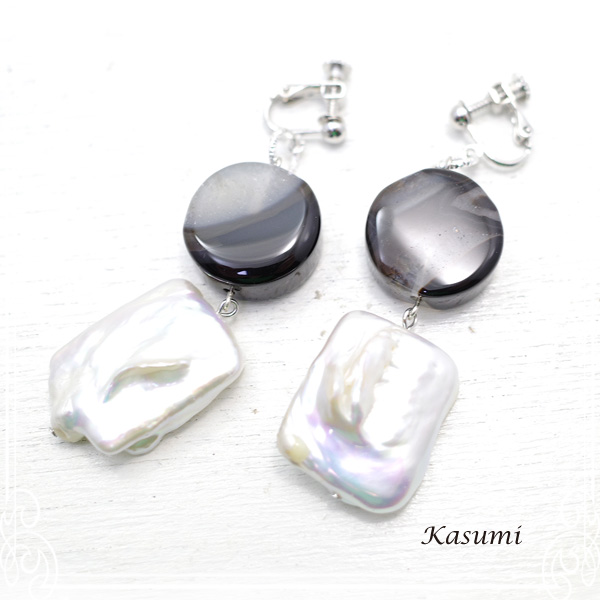 ゚・*:.。..。.:*・゚゚・*:.。..。.:*・゚  ビワ淡水パールとメノウのイヤリング  ゚・*:.。..。.:*・゚゚・*:.。..。.:*・゚