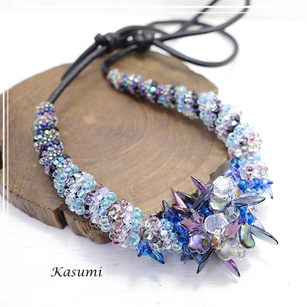 色々な種類のビーズを、スパイラルに編んで、ネックレスにしました。