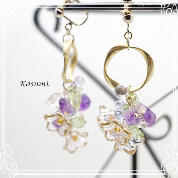 アメジストを加えて、キキョウらしさを出したイヤリングです。