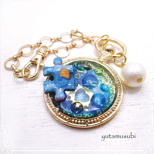 本物のパズルピースを使用。表面はぷっくりと水滴をイメージして仕上げました。
