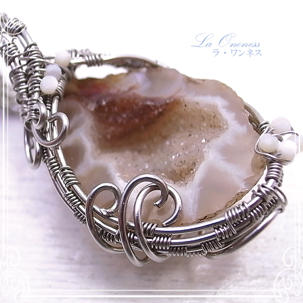 石:モロッコ産ジオード、マザーオブ・パール小粒、 ワイヤー:ステンレスワイヤー