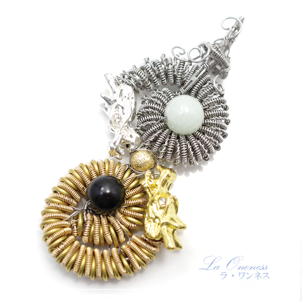 石:ミャンマー産ヒスイ、アルゼンチン産オニキス、合金製龍チャーム、ワイヤー:ステンレスワイヤー、アーティスティックワイヤー