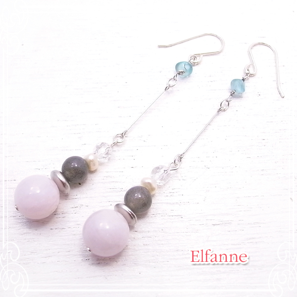 モルガナイト、ラブラドライト、クリスタルクォーツ、アクアマリン、淡水パール、メタルパーツ、ジョイントワイヤー、シルバーピアスフック
