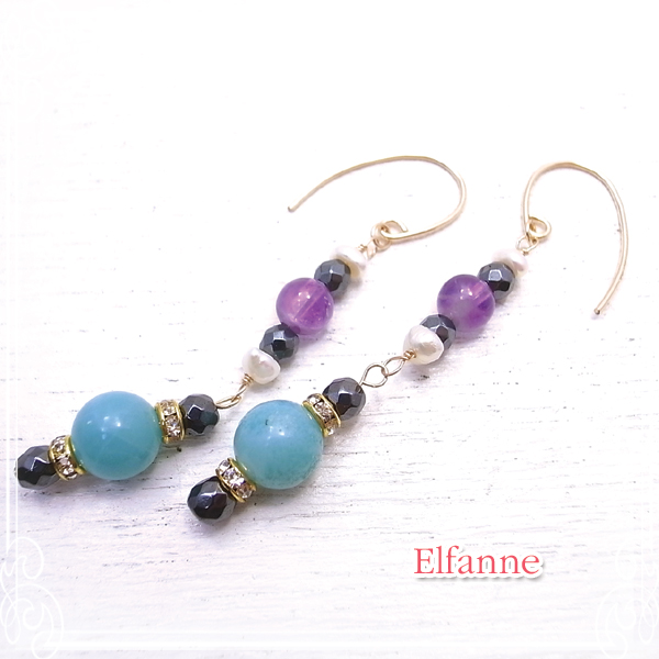 アマゾナイト、ヘマタイト、ラベンダーアメジスト、淡水パール、メタルパーツ(ロンデル、Tピン)、ゴールドフィルドピアスフック