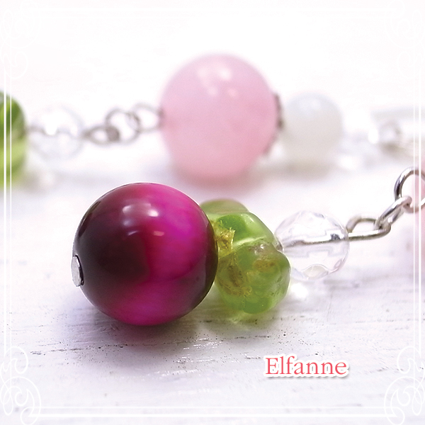 ピンクタイガーアイ8mm、ペリドットさざれ大きいところで6mm、クリスタルクォーツ4mm、ローズクォーツ10mm、ムーンストーン6mm