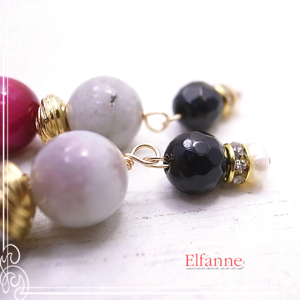 ピンクタイガーアイ、レピドライト、オニキス、淡水パール、メタルゴールドカラーパーツ、メタルロンデル、ゴールドフィルドピアスフック