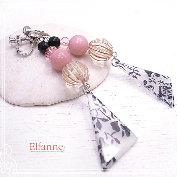 モノトーンのボタニカル柄の三角のパーツと、ピンク系のビーズを合わせました。