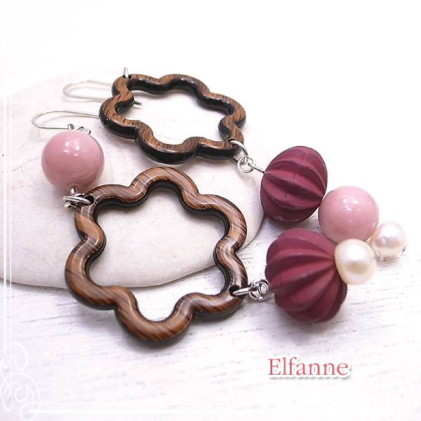 ドイツ製アクリルビーズ(ピンク)、ウッドパーツ(花形)、ウッドビーズ(マットパープル)、淡水パール、丸カン、Tピン、9ピン、ピアスフック(シルバー925)