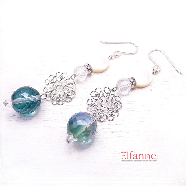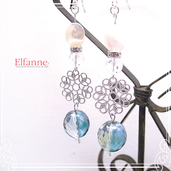 シェル、ロンデル、クリスタルクォーツ、スカシパーツ、チェコビーズ(ブルージルコン)、丸カン、Tピン、9ピン、ピアスフック(シルバー925)