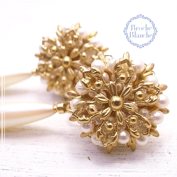 白のパールとつや消しのライトゴールドのヴィンテージパーツで華やかな仕上がりです。