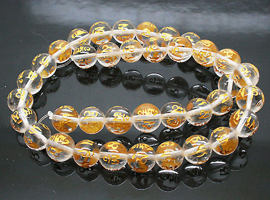 クリスタルクォーツ水晶(Crystal quartz)に金文字で六字真言の彫刻がされた、 丸玉の天然石ビーズパーツです。
